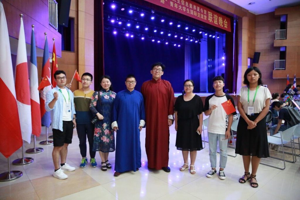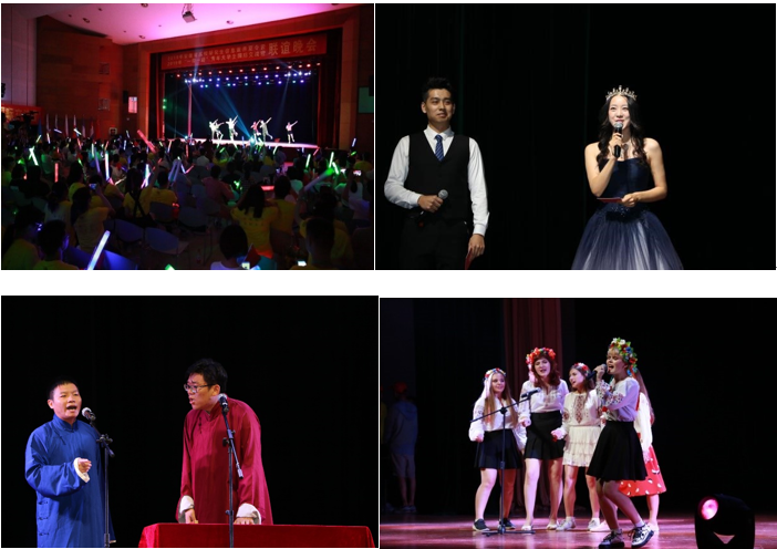 7.10日晚上,中外营员联合文艺汇演在安徽大学磬苑校区大学生活动中心顺利举办,本届文艺汇演主持人由中国科学技术大学卢嘉炜同学以及其他三位同学共同主持。在本次晚会中,中国科学技术大学张昊志、刘高正同学带来了相声表演《成语漫谈》,幽默风趣的相声语言,赢得全场的阵阵掌声。