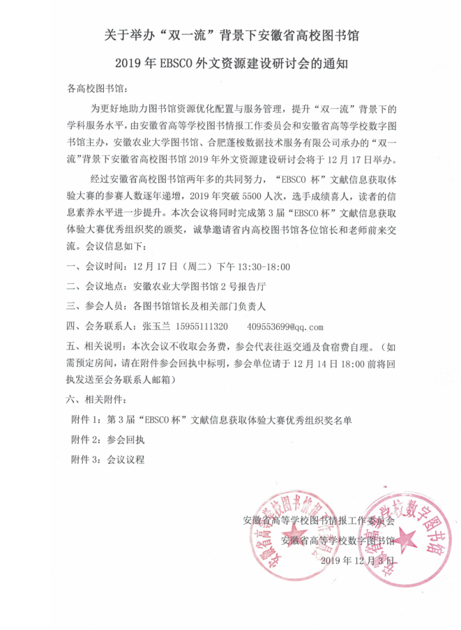 ???为更好的助力图书馆资源优化配置与服务管理,提升“双一流”背景下的学科服务水平,由安徽省高等学校图书情报工作委员会和安徽省高等学校数字图书馆主办,安徽农业大学图书馆、合肥蓬桉数据技术服务有限公司承办的“关于举办“双一流”背景下安徽省高校图书馆2019年EBSCO外文资源建设研讨会”将于12月17日举办。