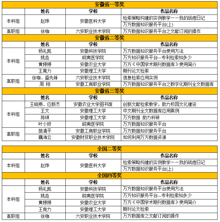 第二届“万方杯”检索课件大赛获奖名单 2019年第二届“万方杯”检索课件大赛,于5月1日–7月28日期间举行,全省高校文献检索教学相关老师,紧扣主题围绕万方数据知识服务平台,提交参赛课件和微课视频。经过专家评审,共评出一等奖本科2项、高职组1项;二等奖本科组4项、高职组2项;三等奖本科组4项、高职组2项。其中一、二等奖作品推荐至全国大赛,获得全国二等奖2项、全国四等奖5项。 特此公布,具体颁奖方式另行通知。