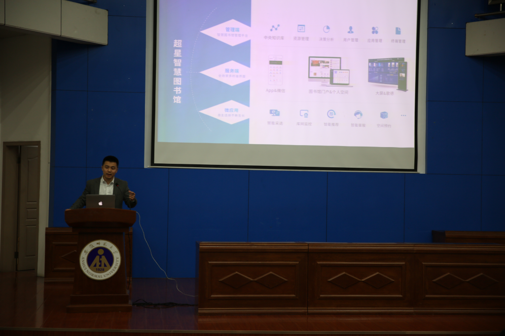 ? ? ? 接下来,超星集团智慧图书馆产品总监宋志森介绍了超星智慧图书馆的产品与应用,超星基于多年在行业的深耕,将过去的积累赋能在智慧图书馆的建设中。超星推出的超微智慧图书馆平台目前已经搭建了强大的中央知识库,整合了936个资源库,1240个资源包。并且可以挂接本馆资源,对所有已购电子资源库及包进行统一管理与分析,并对本馆资源管理决策提供辅助依据。超星智慧图书馆主张智慧管理是一种手段,智慧服务为最终目标。在超微平台上,目前已经为中国矿业大学搭建了57个微应用,涉及业务流程、馆员管理、OA办公、读者服务等方方面面。并且通过移动端、pc端、借阅机、微信等6个终端提升本馆管理效率,提供更优质的读者服务。