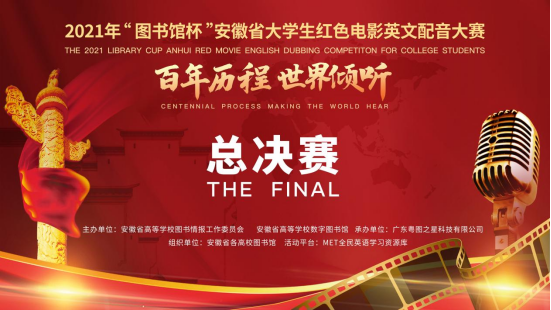 2021年9月25日下午,2021年“图书馆杯”安徽省大学生红色 电影英文配音大赛总决赛在安徽省合肥市举行,来自安徽省不同高校的12组大学生队伍通过网络连线的方式实时竞赛,以默契的团队配合和精彩的配音表现,为现场带来了一场视听盛宴。