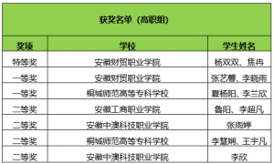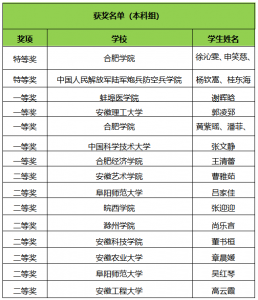 经过选手们紧张激烈的角逐,专家评委们精心筛选、严格把关,最终合肥学院申笑慈组、中国人民解放军陆军炮兵防空兵学院杨钦嵩、桂东海组、安徽财贸职业学院杨双双、焦冉组脱颖而出,荣获安徽赛区决赛特等奖。其中申笑慈、张思妍、杨钦嵩、杨双双4名同学晋级全国总决赛,与其他赛区优秀选手争夺全国总决赛桂冠。