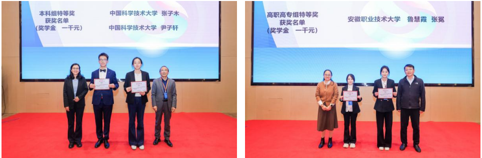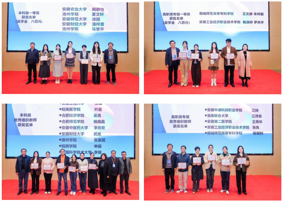 经过层层选拔,安徽赛区本科院校产生特等奖2组,一等奖5组、二等奖8组、三等奖105名,11所院校荣获最佳组织奖,1所学?;裉乇鸸毕捉?,11位老师荣获优秀组织老师,20位老师获优秀指导老师奖;高职高专组产生特等奖1组、一等奖2组、二等奖4组,三等奖50名,5所学校荣获最佳组织奖,5位老师荣获优秀组织老师奖,12位老师荣获优秀指导老师奖。在合肥工业大学图书馆馆长孙祥的主持下,相关获奖人员上台领奖,池州学院学生夏文轩、桐城师范高等专科学校学生王文静、朱梓靓作为学生代表发言,分享了在AI辅助下备赛、学习的心得与感悟。