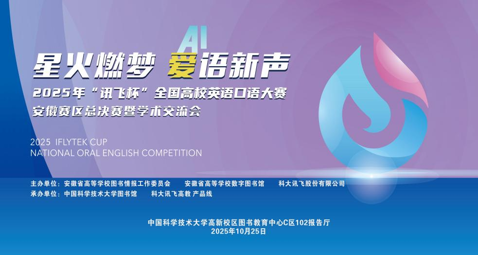 10月25日,由安徽省高等学校图书情报工作委员会、安徽省高等学校数字图书馆、科大讯飞股份有限公司联合主办,中国科学技术大学图书馆、科大讯飞高教产品线承办的2025年“讯飞杯”全国高校英语口语大赛安徽赛区总决赛暨学术交流会在中国科学技术大学高新校区成功举办。本届赛事以「星火燃梦·AI语新声」为主题,共吸引安徽省60所院校逾7000名大学生参与其中,旨在充分发挥人工智能技术在高等教育人才培养中的重要作用,以赛促学、以赛促教,激发高校教与学活力,加速培养新时代创新型、复合型、应用型人才。